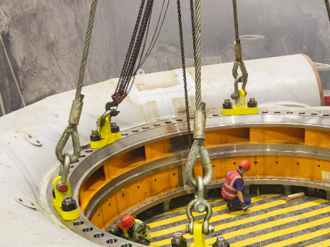 隨著起重設備的緩緩運作,鋼絲繩索具穩(wěn)穩(wěn)地牽引著龐大的蝸殼,按照預設路徑精準移動至安裝位置。整個過程中,索具始終保持穩(wěn)定的受力狀態(tài),憑借其強大的承載能力和可靠的性能,完美配合施工團隊完成了這一關鍵步驟,為水電站后續(xù)的順利建設奠定了堅實基礎。